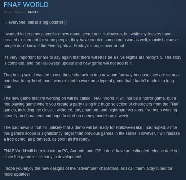 En este post reciente Scott dice que habrá un nuevo juego en Halloween, pero que no será un FNAF 5 o un juego de terror, sino un juego RPG llamado 'FNAF World'.